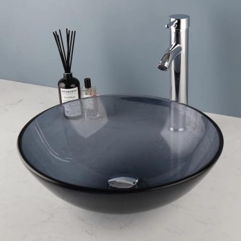 Grey Round Tempered Glass Vessel Sink & Faucet Set with Pop-Up Drain