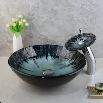 Hand-Painted Tempered Glass Round Bathroom Sink with Chrome Faucet Set
