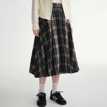 Women’s Retro Plaid A-Line Pleated Mid-Calf Skirt for Winter