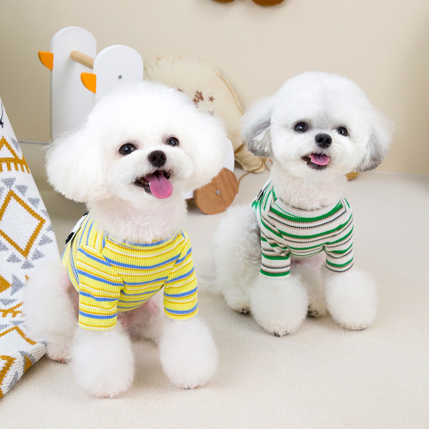 This pullover is more than just a piece of clothing—it’s a must-have for your pet’s wardrobe. Whether your little one is a Bichon, Teddy, or any other small breed, this cozy T-shirt keeps them snug while adding a playful, cartoon-inspired charm. The striped design in bright colors brings out your dog’s personality while ensuring they look absolutely adorable during every walk or cuddle session.