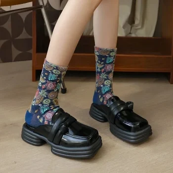 Retro Floral Cotton Crew Socks for Women – 5 Pairs