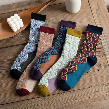 5 Pairs Vintage Peacock Feather Knit Socks for Women – Autumn Winter Style