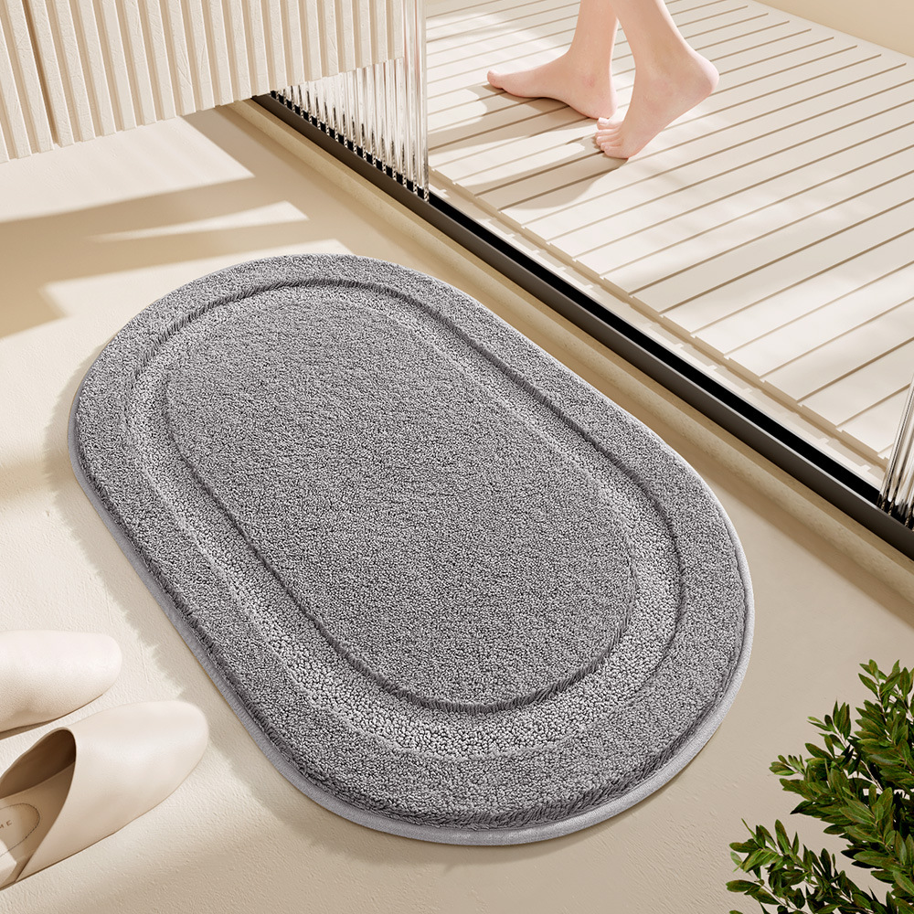 This bath mat is made from premium microfiber with a high-low plush design that combines soft raised fibers with shorter loops for faster drying. It has a strong non-slip rubber backing to keep it firmly in place, even on smooth bathroom floors. The oval shape and solid colors add a modern, clean touch that fits almost any bathroom style.