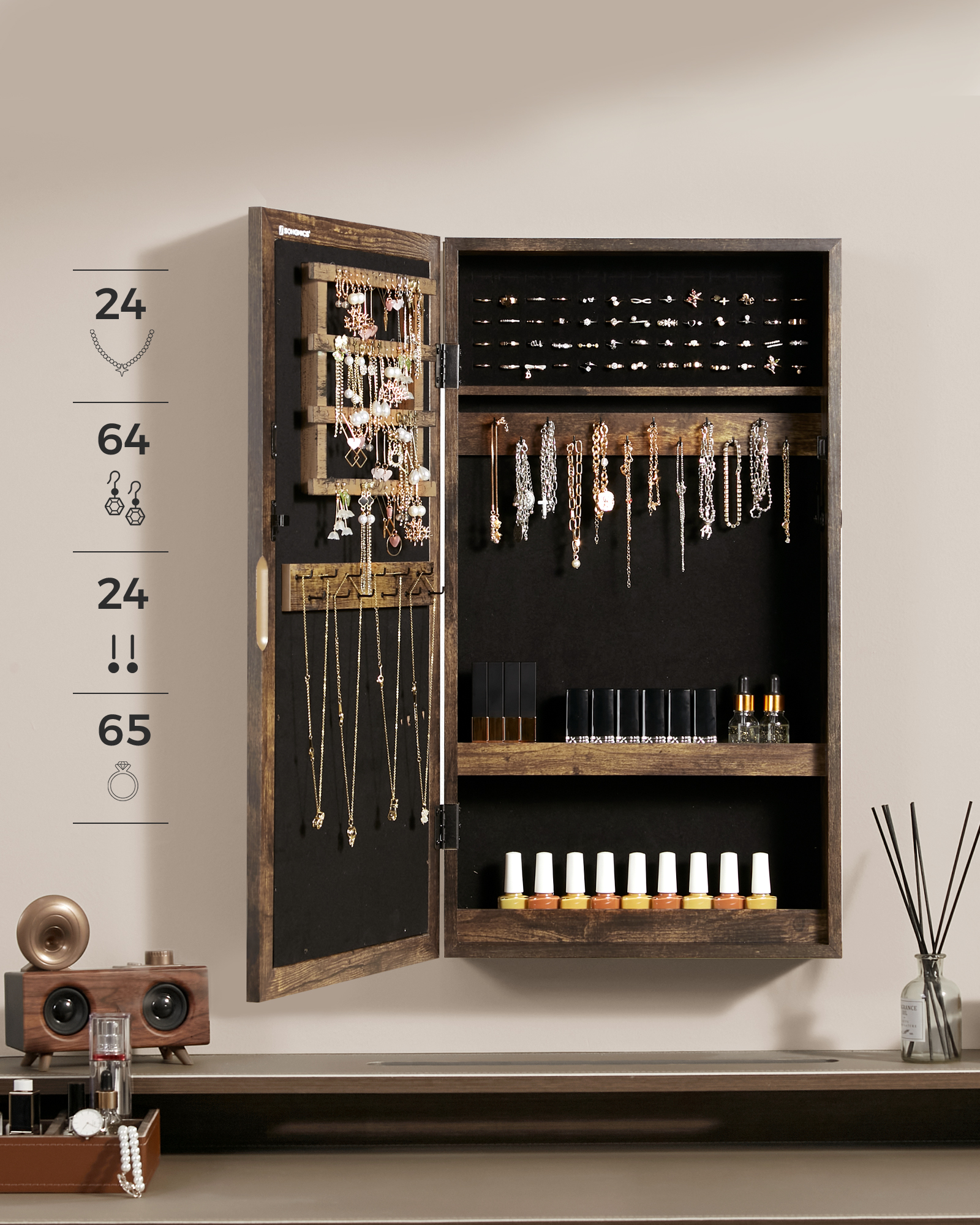 Transform your wall into a personal styling station and keep every cherished piece beautifully organized. Bring home this wall-mounted jewelry cabinet today and enjoy a more elegant, clutter-free way to shine.