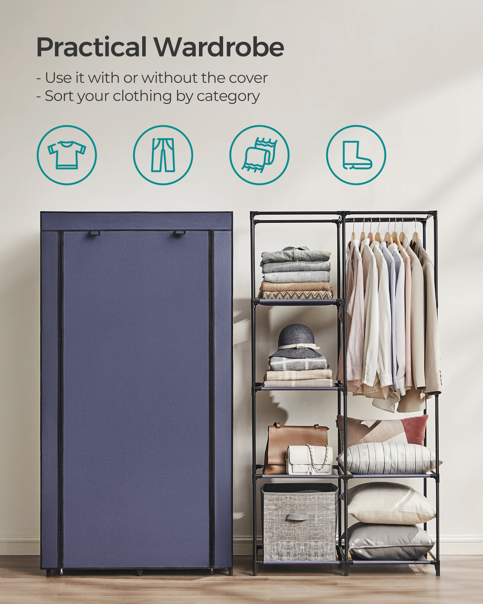 From shirts and jackets to pants, hats, and accessories, this organizer brings all your favorites together in one tidy space. The dark blue fabric cover adds a touch of modern charm while keeping everything behind a clean, zipped-up door. Just roll it down and zip it closed to protect your clothes from dust, spills, and unexpected messes. Lightweight yet strong, it holds up to 99 lb total thanks to metal tubes, durable connectors, and reinforced shelves—giving you dependable support for daily use.