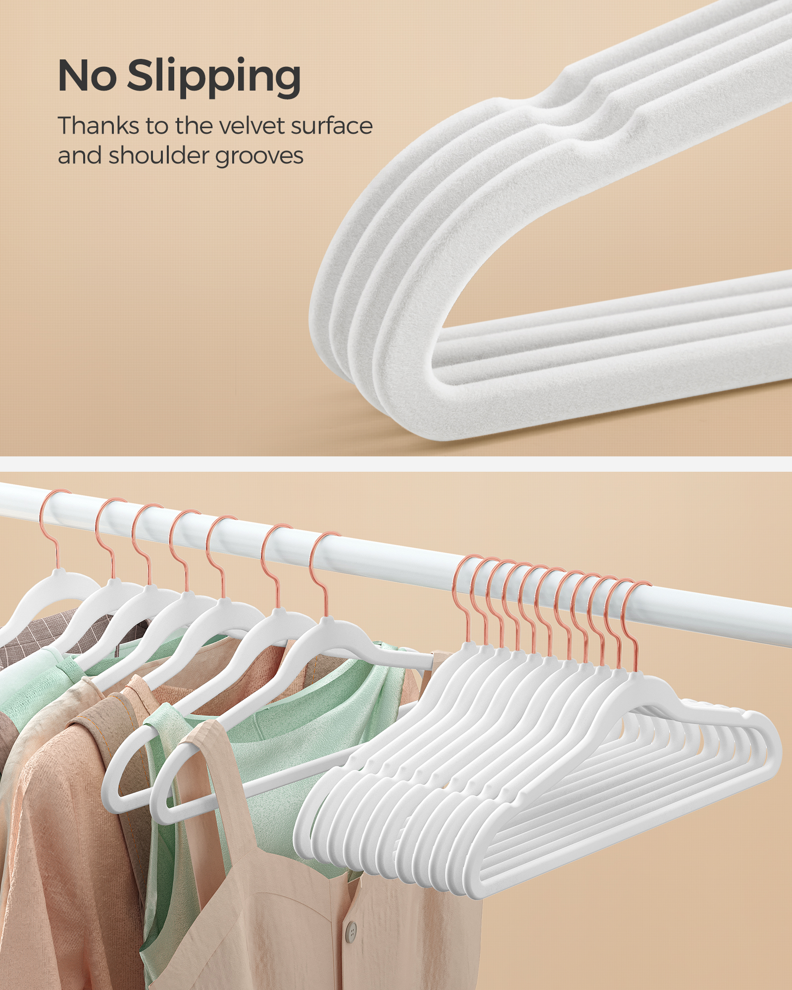 These hangers combine a sleek profile with practical features that make everyday dressing easier. Their soft velvet surface gently grips delicate fabrics, keeping silky tops, camisoles, and lightweight dresses from slipping off. The curved shoulder shape supports shirts and blouses without causing bumps, while built-in grooves secure straps in place. Each hanger includes a 360-degree swivel hook in a stylish rose-gold color, making it easy to turn garments in any direction—perfect for quick outfit planning or reorganizing.
