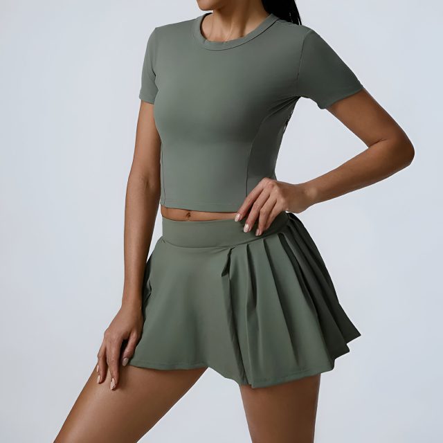 The top offers a true-to-size, body-hugging fit that moves with you without feeling restrictive. The skirted cycling shorts provide coverage and confidence, combining the sporty edge of shorts with the feminine touch of a skirt. With super elasticity and gentle compression, this set enhances your natural shape while allowing full freedom of movement.