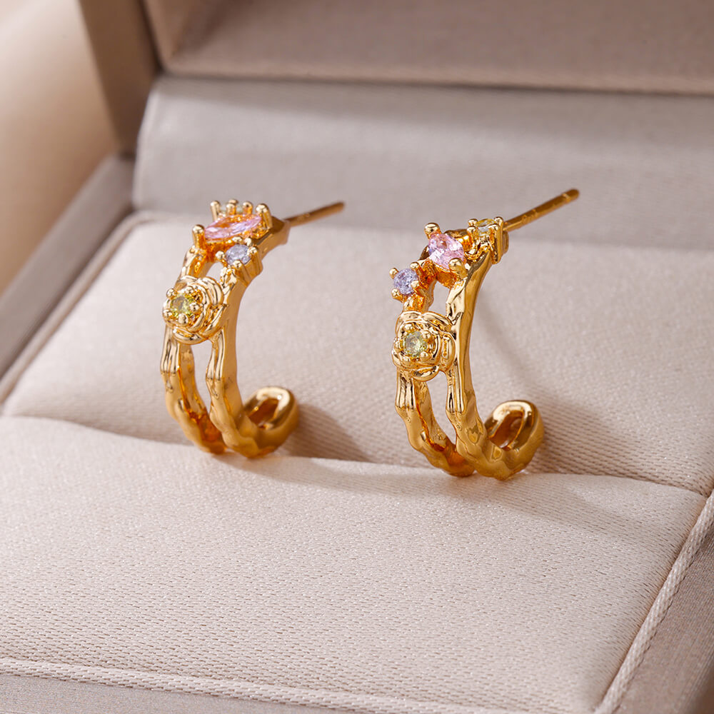 These Stainless Steel Flower Stud Earrings are more than just a pair of earrings—they’re a statement piece. Their colorful zircon stones add the perfect amount of sparkle, making them stand out in a subtle yet sophisticated way. The gold-plated finish ensures that they remain shiny and eye-catching for long periods, without fading. Made from high-quality stainless steel, these earrings are not only beautiful but also built to last, making them an excellent investment for your jewelry collection.