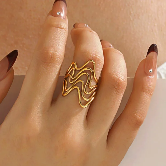 Crafted from high-quality stainless steel and finished with luxurious 18k gold plating, this ring is both durable and timeless. The multilayer wave pattern creates a fluid, modern look, while the open-ended design allows for easy adjustment and all-day comfort. With no harsh chemicals used in production, you can wear it with peace of mind knowing it’s safe for your skin.