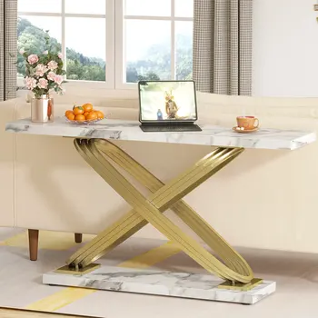 55 Inch Modern Gold Console Table with Faux Marble Top for Entryway or Sofa