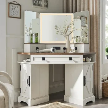 48″ Farmhouse Corner Vanity Desk with Lighted Mirror & Charging Station