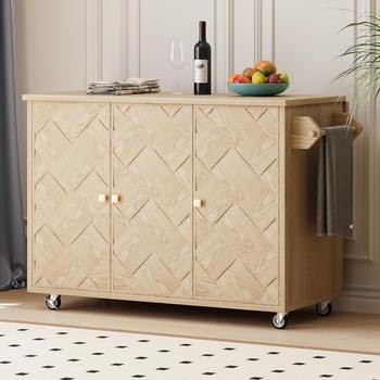 Coastal Handwoven Ash Veneer Mobile Kitchen Island with Drop Leaf & Wheels