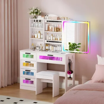 Modern Vanity Desk with Sliding Mirror, RGB Lights & Charging Station