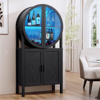 Modern Rounded Bar Display Cabinet with LED Lights & Glass Doors – 65″ Tall Wine Storage