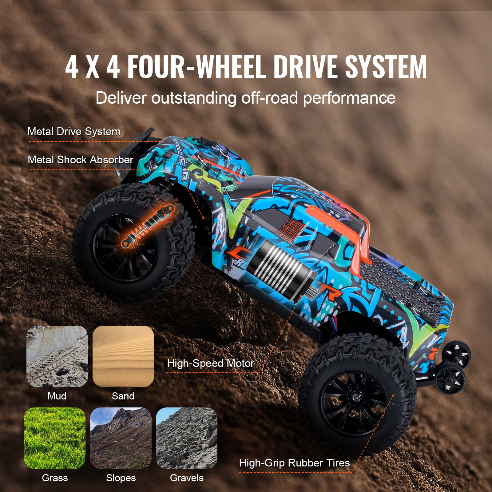 Equipped with high-grip rubber tires, a metal drive shaft, and shock-absorbing suspension, this RC car is made to conquer all kinds of terrain — from grass and mud to sand and slopes. The four-wheel drive system ensures stability and smooth handling, while the 328–492 ft remote range gives you complete control even from afar. With stepless speed regulation, you can switch from gentle cruising to full-speed racing — perfect for both beginners and experienced drivers.