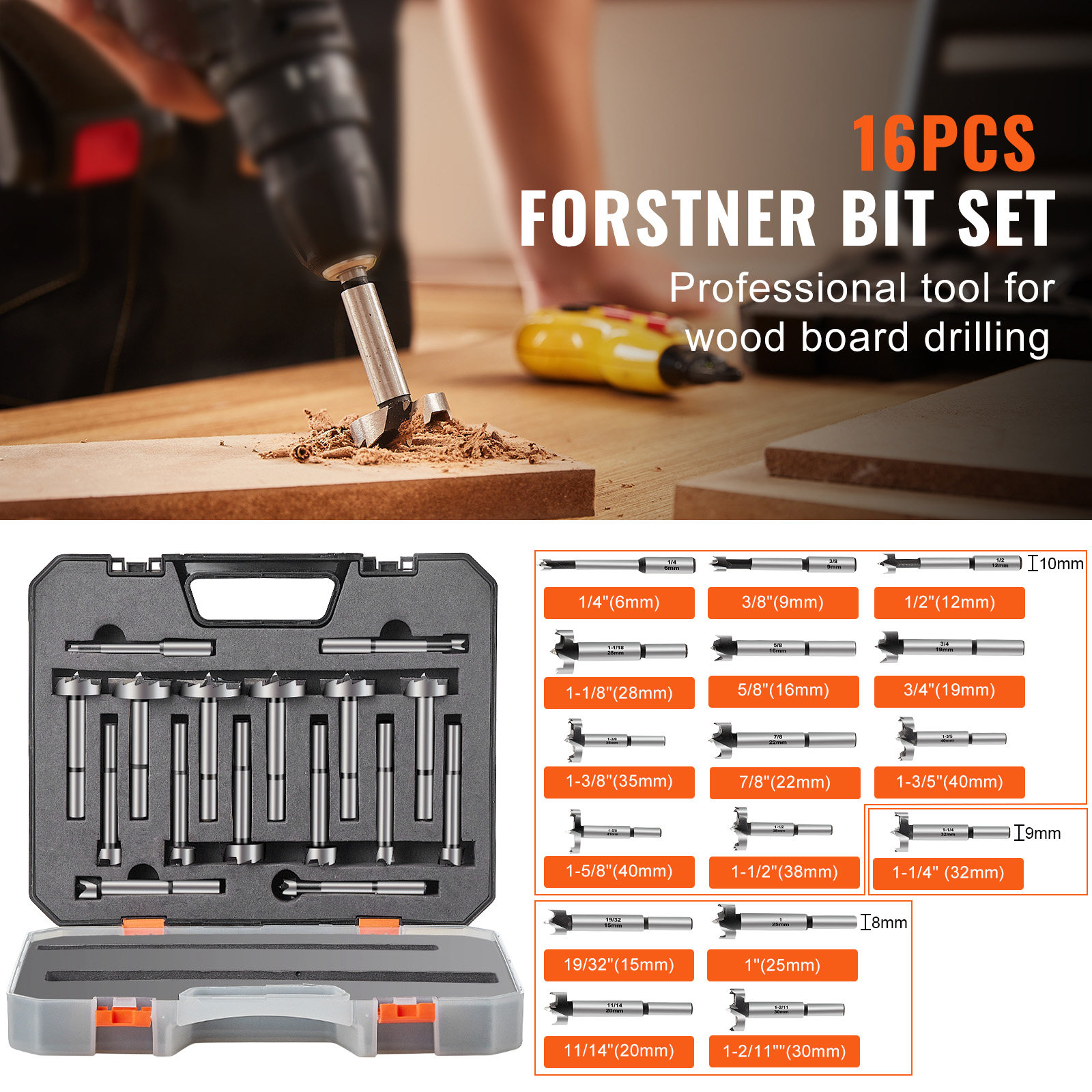 Experience the power of clean, precise drilling with this 16-piece forstner drill bit set, crafted for woodworkers who want flawless results every time. Whether you’re building furniture, crafting custom décor, or tackling everyday woodworking tasks, these bits deliver exceptional control and beautifully smooth boreholes. Made from fully ground carbon steel, each bit cuts effortlessly through softwoods, hardwoods, and composite boards while staying sharp and strong, even under high heat.