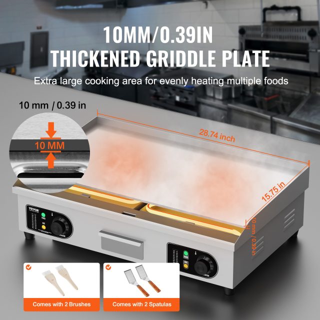 From crispy bacon and fluffy pancakes to juicy burgers and tender steaks, this electric griddle handles it all. It’s perfect for breakfast, lunch, and dinner service in both home and commercial kitchens. Simply set it up on a heat-resistant surface, power it on, and watch your cooking game transform.