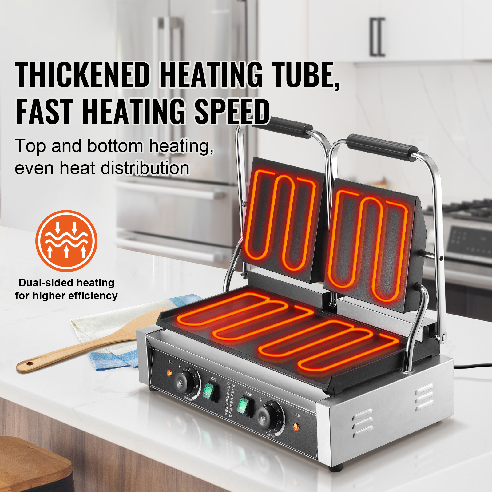 Transform the way you cook with this 3600W commercial panini grill—a versatile powerhouse designed to handle everything from crispy paninis and grilled cheese to juicy steaks and full breakfasts. Its generous 19×9 inch double grilling surface offers plenty of space to cook multiple foods at once while keeping a compact footprint on your countertop. Ideal for home entertainers, bustling food stalls, and busy restaurant kitchens, this grill delivers fast, even cooking without the hassle of flipping.