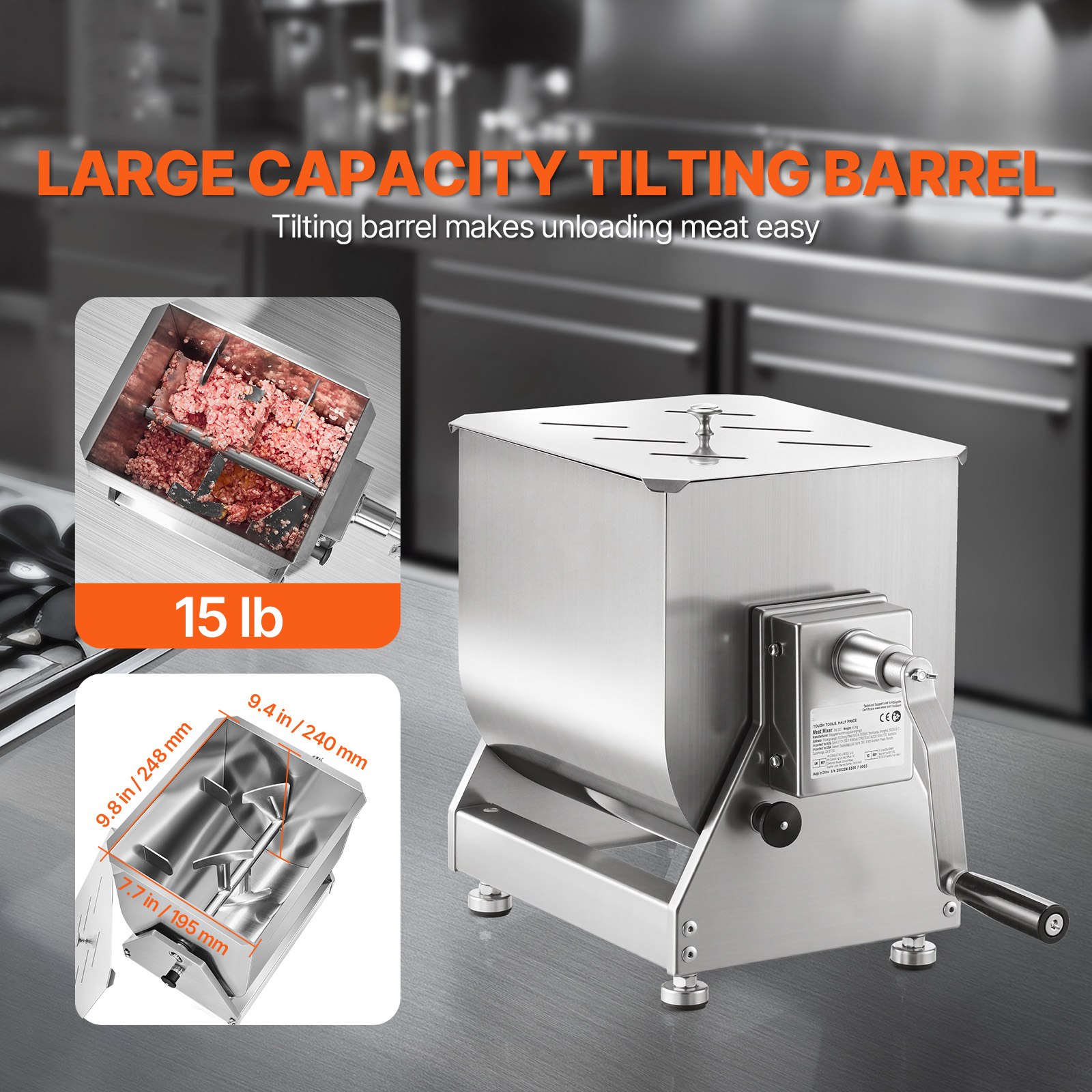 Bring efficiency and precision to your kitchen or butcher shop with the Manual Meat Mixer 10L. Designed for both professionals and home cooks, this durable stainless-steel mixer takes the hard work out of blending meats, seasonings, and sauces. Its large 15 lbs (10L) capacity allows you to prepare generous batches of sausage fillings, burger blends, or even animal feed — all with ease and consistency. The tilt-tank design ensures quick unloading and easy cleanup, saving you valuable time during busy prep sessions.