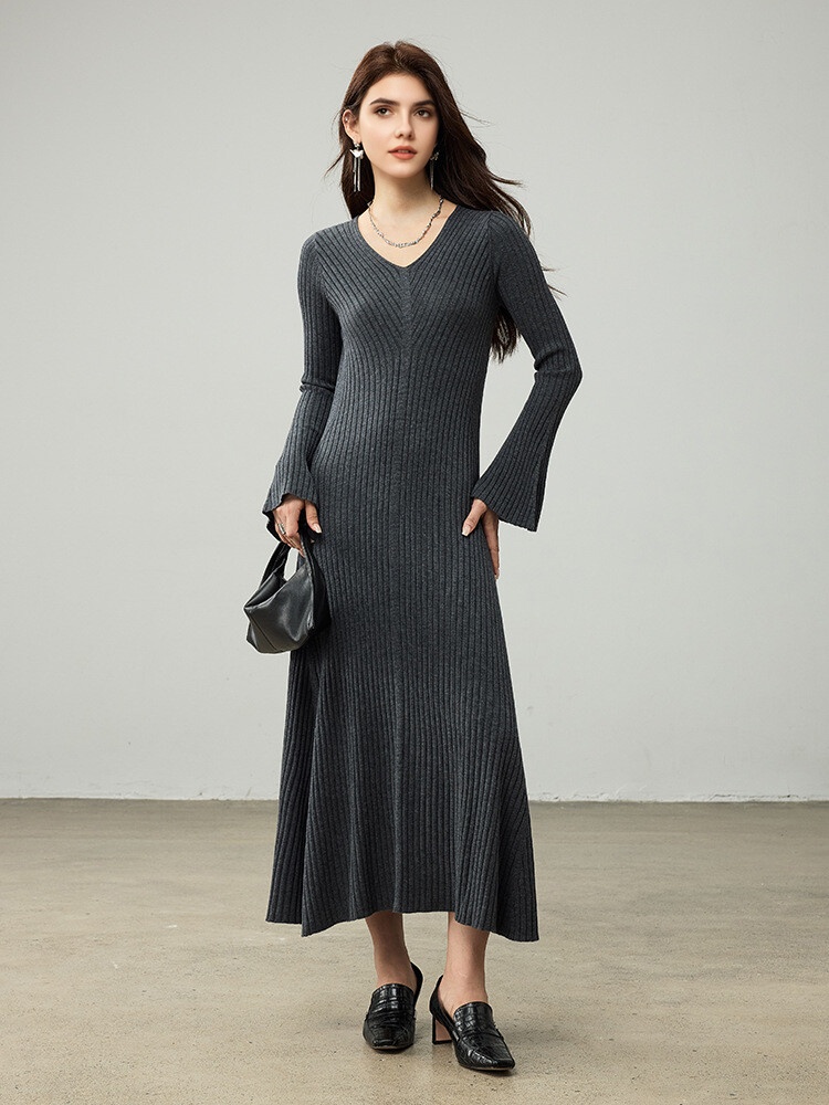 Crafted from a luxurious mix of natural fibers — including wool, acrylic, and polyester — this dress delivers warmth on chilly days without feeling bulky. The beautiful V-neckline adds a touch of femininity, while the full-length flare sleeves bring graceful motion to every gesture. The slim sheath silhouette follows your natural curves, and the pullover design makes dressing simple and convenient. Available in timeless shades of black and beige, it pairs effortlessly with boots, heels, and your favorite accessories.