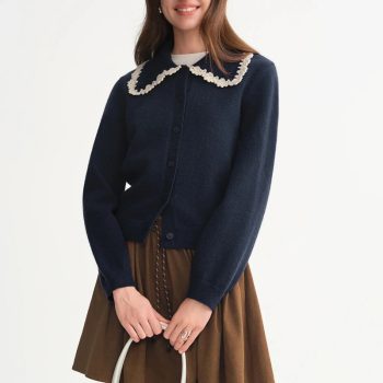 Women’s Embroidered Flower Knit Cardigan with Lace Turned-Up Collar