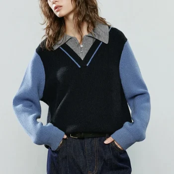 Asymmetric Retro Color-Block Women’s Winter Sweater – Cozy Two-Layer Pullover