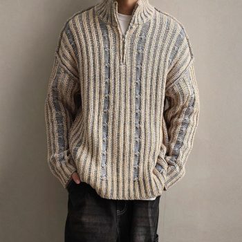 Men’s Vintage Striped Knit Jumper with Zipper Stand Collar