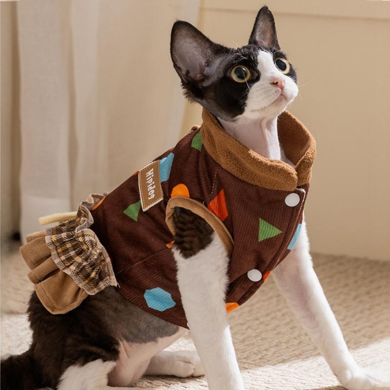 Every detail of this pet dress has been thoughtfully created for both style and function. The grid lace and ruffled hem bring an elegant flair, while the built-in traction buckle makes outdoor strolls a breeze. The corduroy fabric feels velvety soft against your pet’s fur, and the inner fleece lining provides extra insulation without bulk. Available in warm yellow and brown shades, it’s the perfect combination of sweet and seasonal charm.