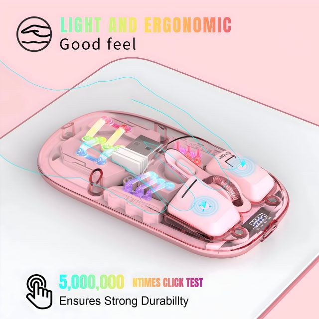 This wireless mouse brings you advanced convenience and a unique design. With dual connectivity options, you can connect to two devices at once and switch between them seamlessly. The fully transparent PC material gives it a futuristic look, while the built-in rechargeable battery ensures hours of uninterrupted use. Enhanced precision and customizable lighting make it an essential companion for productivity and creativity alike.