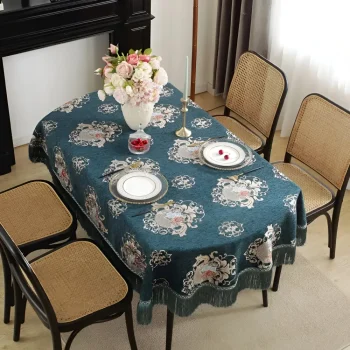 Elegant Chenille Tassel Tablecloth – Floral Embroidered Table Cover for Home & Events