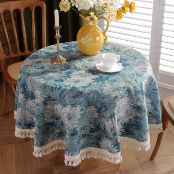 Vintage Blue Daisy Tassel Round Tablecloth – Polyester Cotton Jacquard Coffee Table Cover