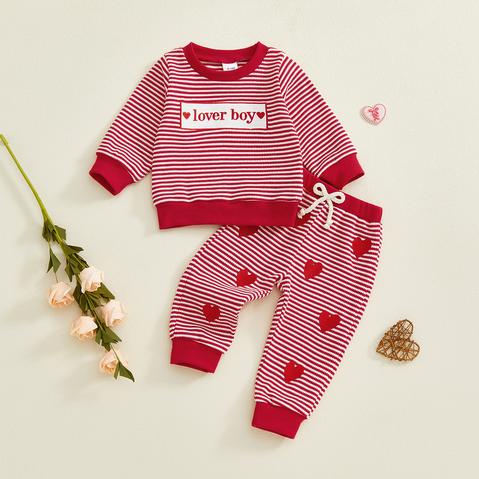 Dress your little one in love this Valentine’s Day with this adorable toddler boy outfit set. Designed to feel soft, look charming, and move easily with your baby, this two-piece set brings together playful stripes, sweet letter embroidery, and heart-print pants in a festive red tone. It’s the perfect balance of comfort and cuteness, made for babies and toddlers from newborn up to 3 years old.