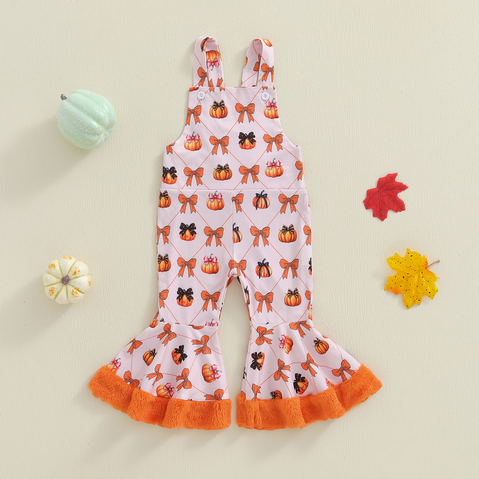 Let your little one shine this season in our Toddler Girls Pumpkin Bow Flare Overalls Romper. Designed with love and crafted for comfort, this charming outfit is the perfect blend of playful design and cozy wear. The cute pumpkin and bow print adds a festive touch, while the plush patchwork and flared bell-bottoms bring a trendy twist to your toddler’s wardrobe. Whether it’s a fall family outing, a playdate, or a special photo shoot, this romper is made to turn heads and capture hearts.