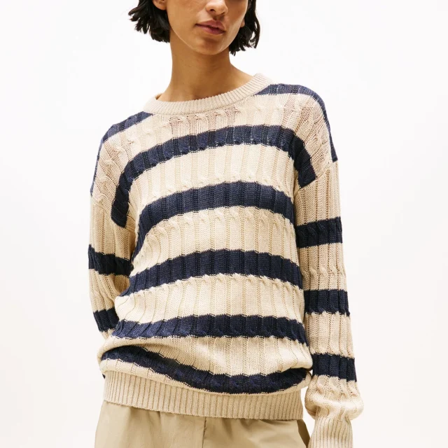 The Tommy Hilfiger Women’s Knitwear is not just another sweater—it’s a timeless piece that combines comfort and style in one effortlessly chic design. The beige color is versatile enough to pair with your favorite jeans, skirts, or even leggings. The striped pattern adds a pop of detail while keeping it understated enough for any occasion, from casual outings to more dressed-up affairs.