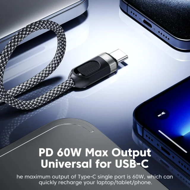 This cable supports fast charging for both USB-C and Lightning devices. The USB-C side delivers up to 60W power output for compatible smartphones and tablets, while the Lightning connector provides up to 2.4A flash charging for iPhones and iPads. It also allows data transfer at speeds up to 480Mbps on USB-C, making file transfers quick and smooth.