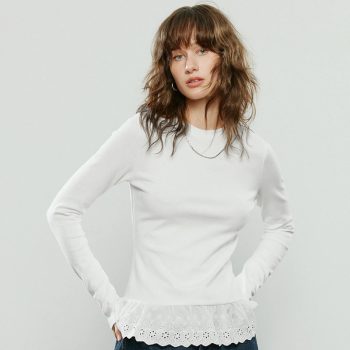 Winter Women’s Slimming Contoured Fit Mock Layer T-Shirt – Textured Lace Trim Knit Top