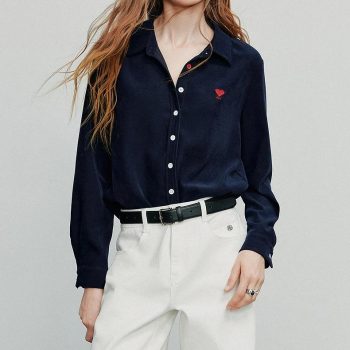 Plush Heart-Embroidered Button Blouse for Women