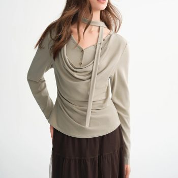 Plus-Size Layered Art Long-Sleeve T-Shirt with Floating Ribbon Neckline for Curvy Women