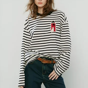 Women’s Long-Sleeve Cat Applique Embroidery Crew-Neck Slimming Top