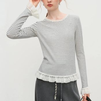 Women’s Striped Knit T-Shirt with Lace Trim Long Sleeve Soft Stretch Layer Top