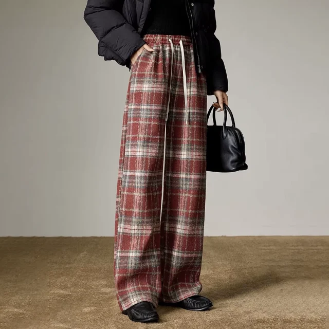 High-Waisted Plaid Wide-Leg Winter Trousers for Women