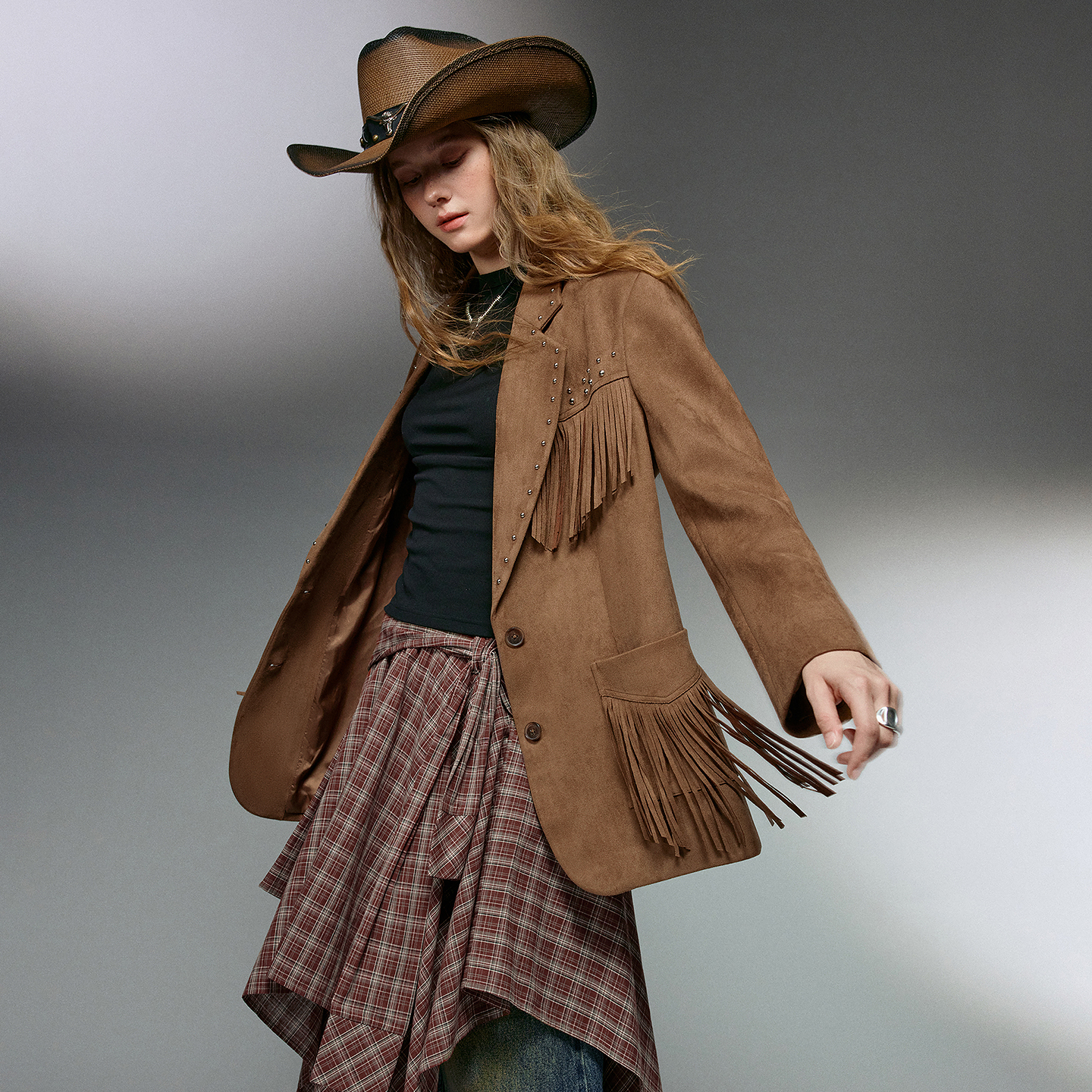This women’s oversized blazer is not just another piece in your wardrobe – it’s an investment in style and comfort. Its unique combination of vintage charm and modern sophistication makes it an essential staple for any fashion-forward woman. The suede texture adds a luxurious feel, while the playful tassel and bead details make it stand out from typical office wear. Whether you’re pairing it with jeans for a weekend look or wearing it over a sleek dress for the office, this blazer ensures you look effortlessly chic.