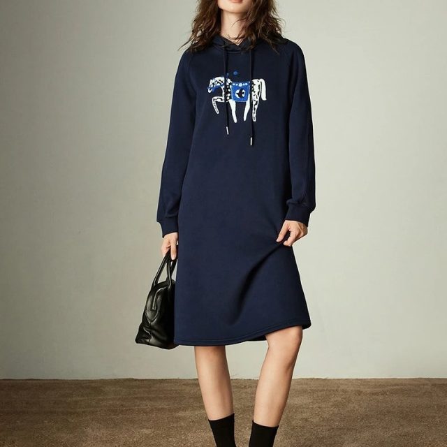 The beautiful horse embroidery adds a playful yet elegant touch, giving this dress a unique character that stands out from plain winter wear. The hooded neckline and raglan sleeves create a casual, sporty feel, making it perfect for everyday wear, work-from-home days, casual office settings, or weekend outings. Its knee-length cut pairs easily with boots, sneakers, or leggings for a complete winter look.