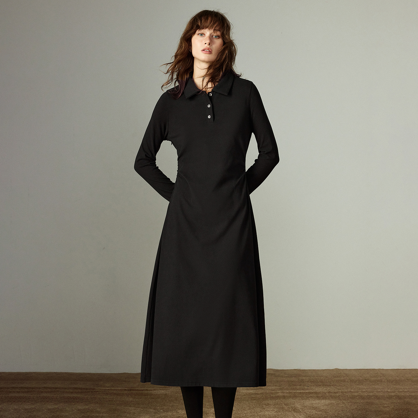 This mid-calf dress is best worn throughout the winter season, whether you’re heading to the office, meeting friends, or layering it for weekend outings. The full-length sleeves, warm knit texture, and pullover design make it a reliable go-to piece when temperatures drop. What makes this dress special is its perfect balance between comfort and style: the classic polo neckline and button detail add a refined touch, while the waist-cinched design subtly defines your figure without feeling restrictive.