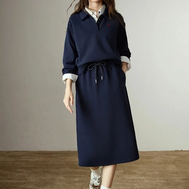 Designed with a relaxed fit, the pullover hoodie features a stylish polo-neck collar and delicate embroidery for a subtle premium finish. The matching midi skirt falls around mid-calf, making it flattering, cozy, and easy to style with boots or sneakers. Whether you’re going for a casual walk, meeting friends, or working from a cozy café, this set keeps you warm while looking effortlessly chic.