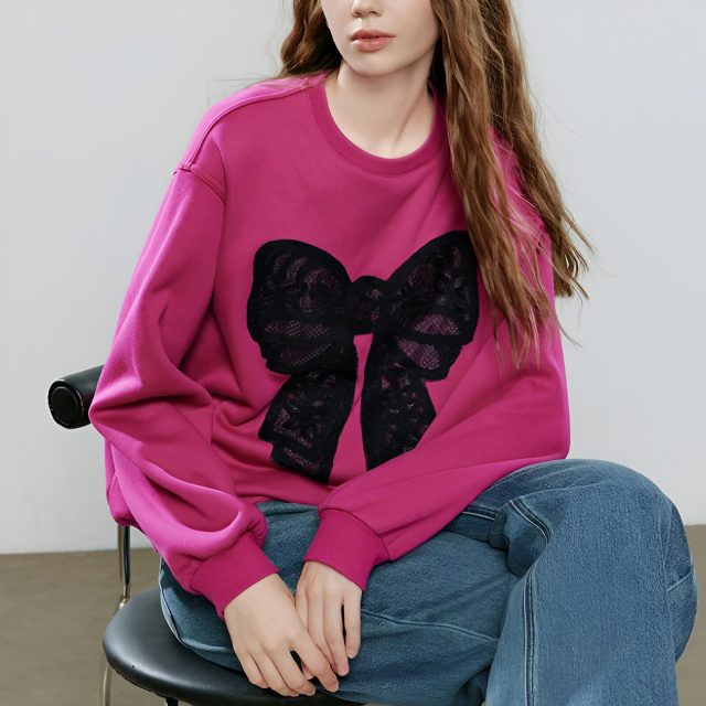 Unlike ordinary sweatshirts, this hoodie stands out with its graceful bow accent and lace detailing that elevate your everyday wardrobe. The fabric blend of cotton and polyester gives you the perfect balance of softness and durability, while the medium-weight knit keeps you warm without overheating. The crew neck design adds comfort and makes layering easy during colder months.