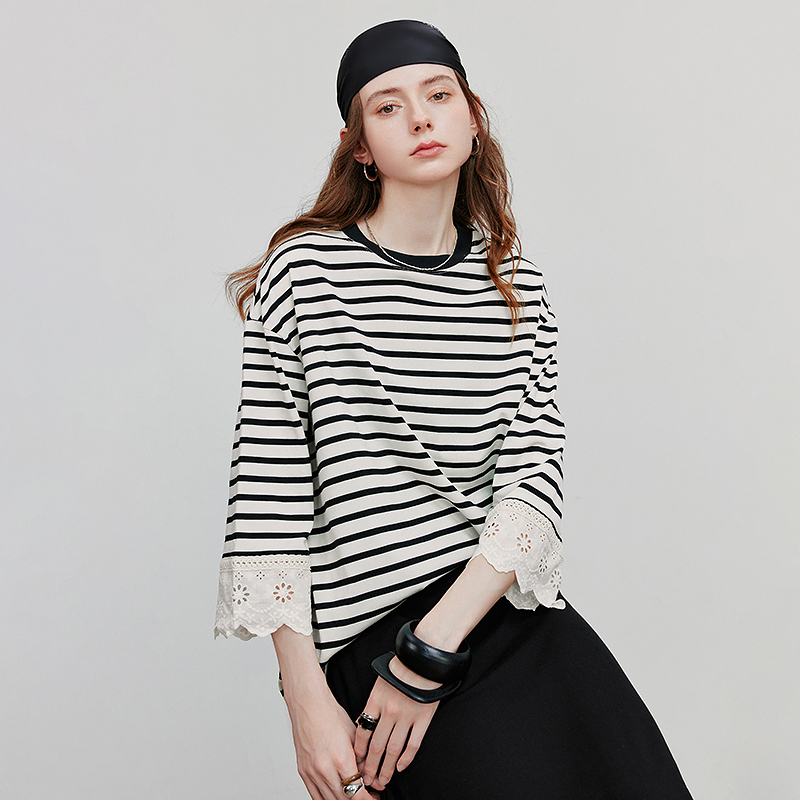 This top is not just a basic T-shirt—it’s a statement piece that combines comfort with style. The breathable cotton blend ensures that you stay comfortable throughout the day, while the lace and striped design add a modern yet timeless appeal. Whether you’re heading to the office, meeting friends for brunch, or enjoying a day out, this T-shirt has you covered.