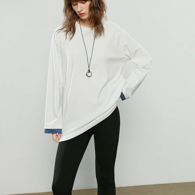 This winter T-shirt is more than just another top – it’s a statement piece. The spliced denim design adds a modern twist to a classic style, making it stand out in the best way. The combination of soft polyester and spandex ensures comfort that lasts all day, while the high stretch gives you the freedom to move. The mid-length cut and regular fit make it easy to pair with virtually anything in your wardrobe, from skirts to pants, making it a go-to item for any occasion.