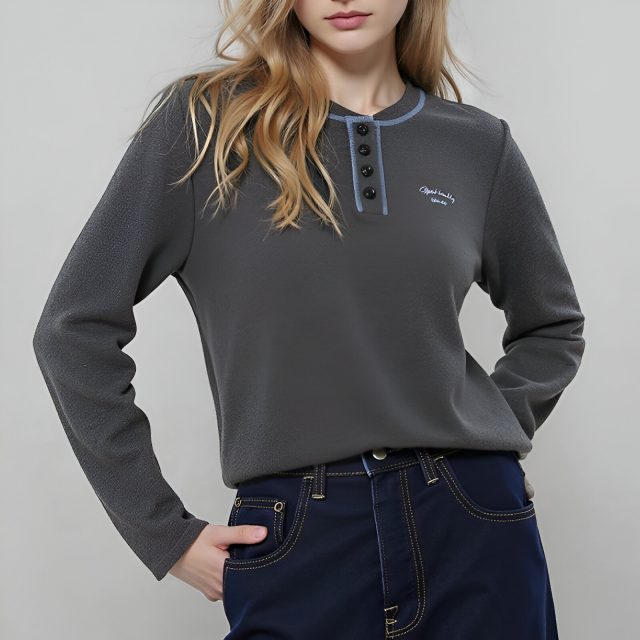 This asymmetric winter top is all about versatility and style. The contrast color design adds a pop of personality to your winter basics, while the cotton and spandex blend ensures a comfortable, breathable fit. Whether you’re heading to the office, meeting friends, or lounging at home, this top is perfect for any occasion. The high-stretch fabric allows you to move freely, and the loose fit ensures all-day comfort. With its timeless classic style and button accents, it’s a top that transitions seamlessly from day to night. This stylish top is designed for middle-aged women who want a flattering, modern look without sacrificing comfort.