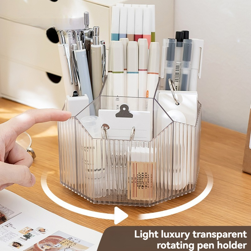 Keep your desk stylishly clutter-free with the Transparent Rotating Pen Holder. Designed with a modern, light-luxury aesthetic, this organizer adds a touch of sophistication to any office, home study, or classroom. Its clear plastic construction allows you to easily see and access your stationery, while the smooth 360° rotation makes finding your favorite pen, scissors, or marker effortless. Perfect for those who value both practicality and elegance in their workspace.